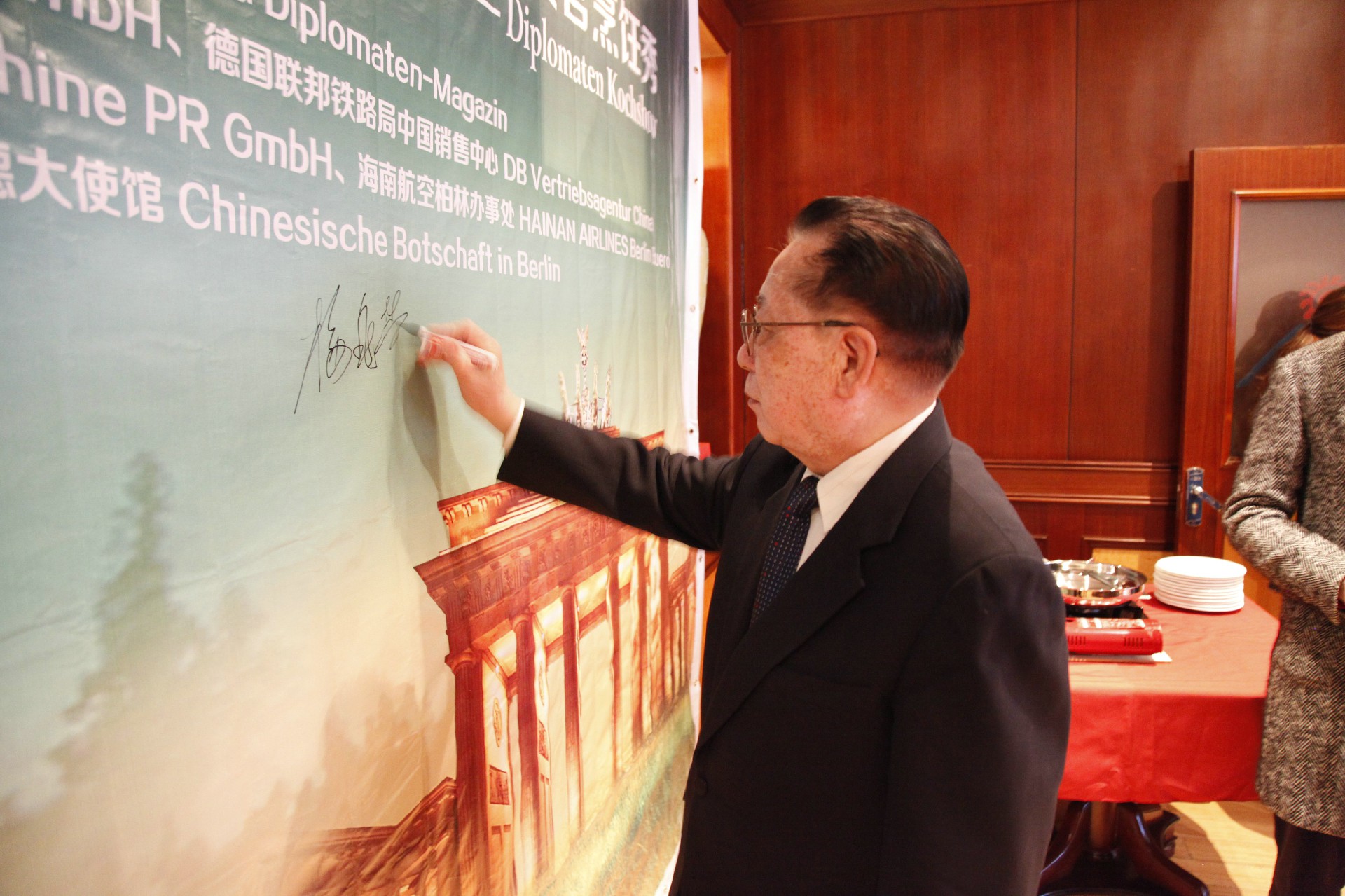 当天天气晴朗,大雪刚过,外面铺着薄薄的一层白雪。梅大使在现任驻德大使史明德陪同下,准时来到会场。我以主办方代表的身份迎接了他们。来参加活动的中德嘉宾有六七十位,包括德国原驻中国公使、普鲁士研究学会会长等多位德国嘉宾。中方有中国驻德使馆、中国驻德各媒体,如新华社、人民日报和驻德国的中资企业、华侨代表等。中外来宾济济一堂,气氛十分热烈友好。会场的背景板有10平方面积,背景上是北京天坛和德国勃兰登堡门,整个图案底色为绿色。